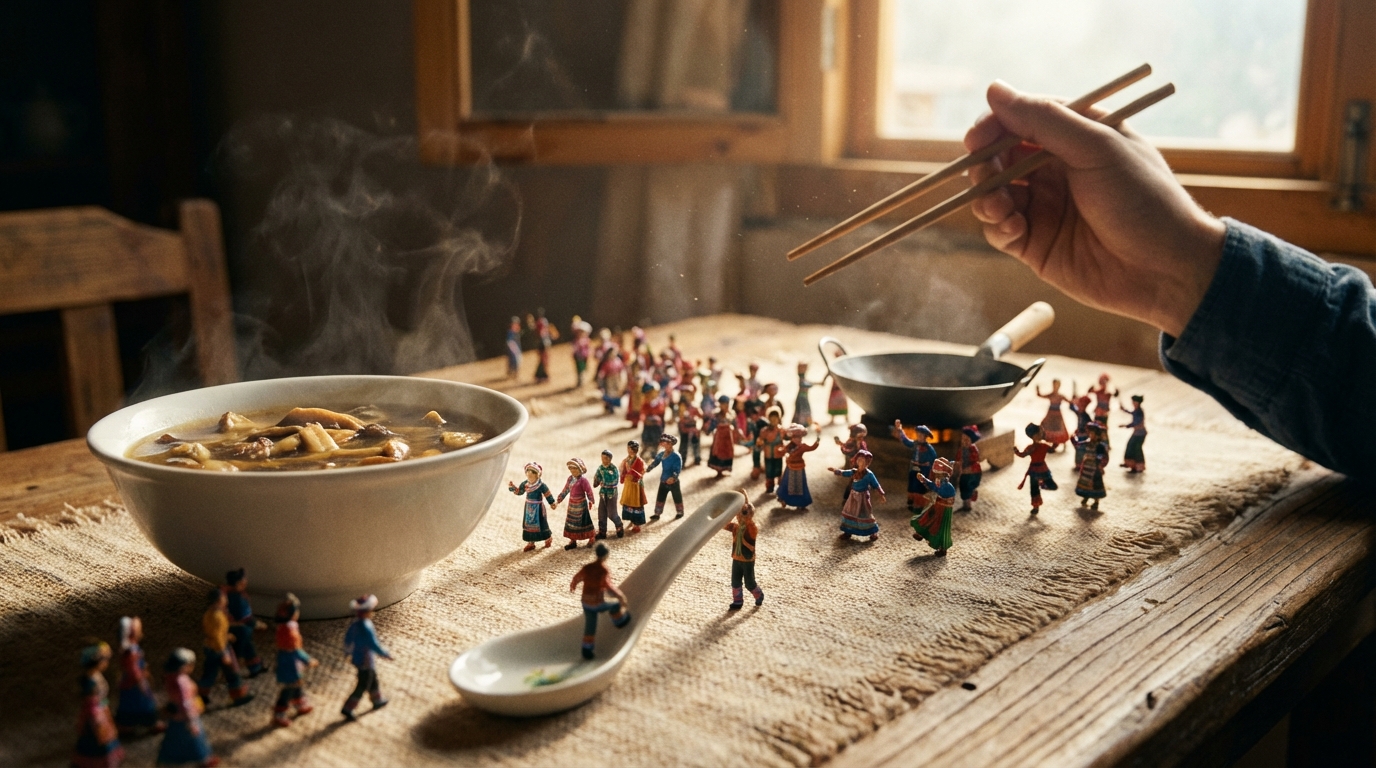 Imagina la escena: estás sentado a la mesa, listo para disfrutar de un plato de hongos salteados, un manjar local muy apreciado. El sabor es terroso, profundo, delicioso. Pero, de repente, el mantel empieza a moverse. No es el viento. Son cientos de figuras diminutas, vestidas con ropas de colores brillantes, marchando entre los platos, trepando por tu cuchara y nadando en tu sopa.